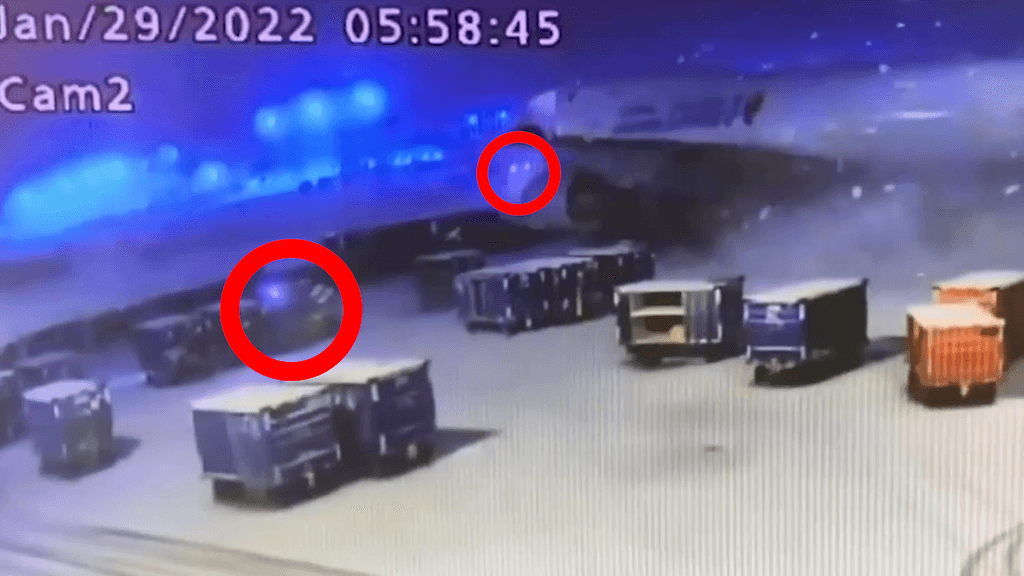 Valvontakameramateriaalilta on nähtävissä, kuinka rahtikoneen vasen siipi törmää kentän laidalla sijainneisiin matkatavaravaunuihin.