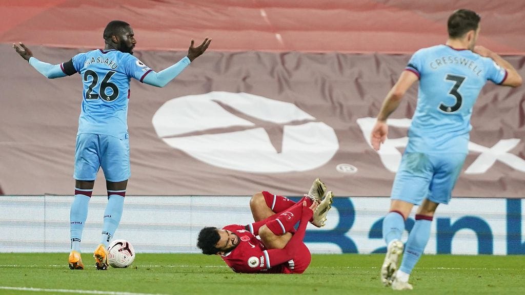 Salah kaatui nurmen pintaan rangaistusalueen sisällä West Ham -puolustaja Arthur Masuakun kömpelön taklauksen jälkeen. Tilanteesta seurasi rangaistuspotku, jonka Egyptin maajoukkuetähti laukoi itse sisään tasoittaakseen pelin Anfieldilla.