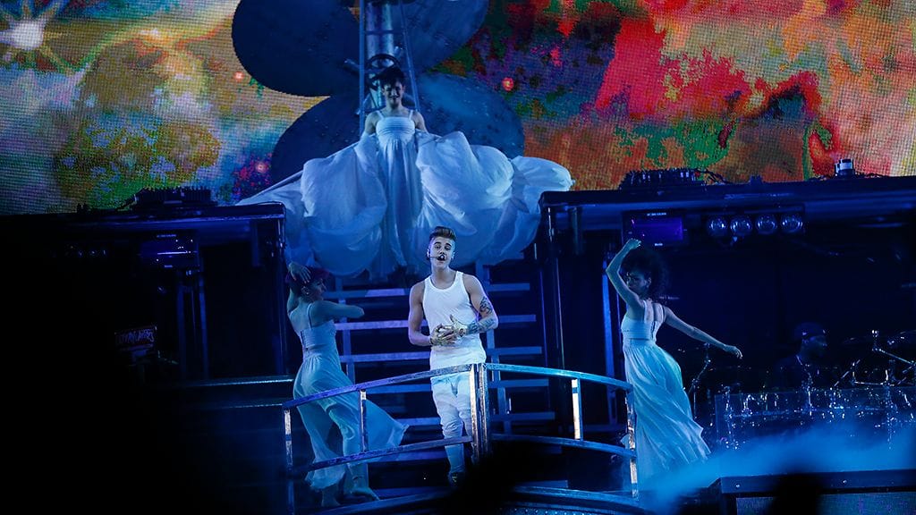 Bieber itse saapui lavalle vaijereita pitkin areenan katosta, suuret siivet selässään ja kokonaan valkoiseen pukeutuneena. Viimeistään tässä vaiheessa meininki yleisössä räjähti liekkeihin. Aluksi Bieber vaihtoi vaatteitaan tiuhaan tahtiin, mutta loppua kohden hurmuri viihtyi löysissä housuissa ja nahkatakissa, jonka alla hänellä ei ollut paitaa.