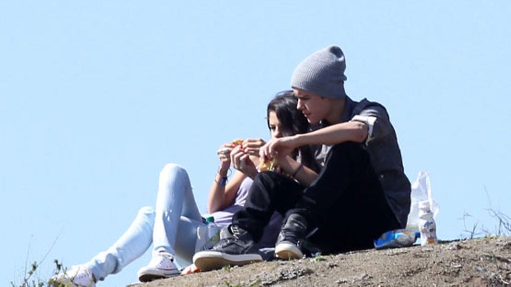 Teinisensaatio Justin Bieber nautiskeli kaikessa rauhassa eväitä tyttöystävänsä Selena Gomezin kanssa puistossa Los Angelesissa.