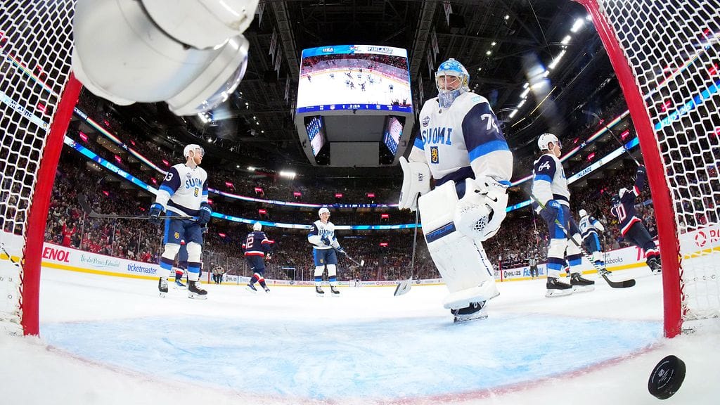 Leijonien maalivahti Juuse Saros epäonnistui USA-ottelun kolmannen erän alkuhetkillä NHL:n 4 Nations Face-off -turnauksessa.