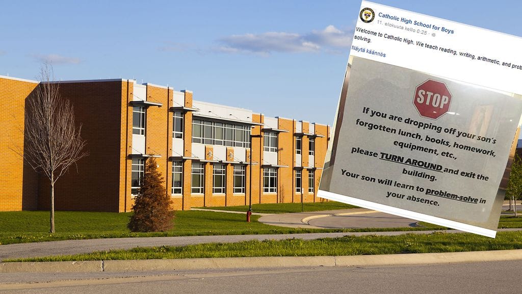 Katolinen poikakoulu oli nimittäin liimannut oveensa lapun, jossa luki: "Jos olet tuomassa poikasi unohtunutta lounasta, kirjoja, kotiläksyjä, välineitä tai muuta sellaista, ole hyvä, käänny ympäri ja poistu rakennuksesta. Poikasi oppii ratkomaan ongelmia poissa ollessasi."
