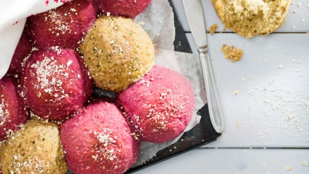 Tee kaksi sämpylätaikinaa, laita toiseen punajuurta ja toiseen pinaattia. Asettele eriväriset sämpylät vieri viereen uunipellille, saat näyttävän sisarussämpyläparven.