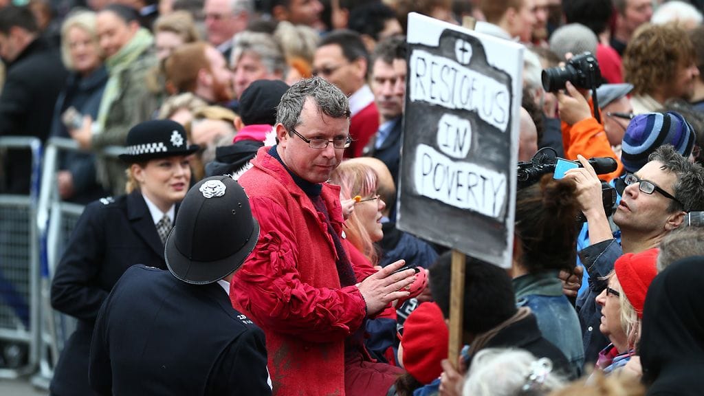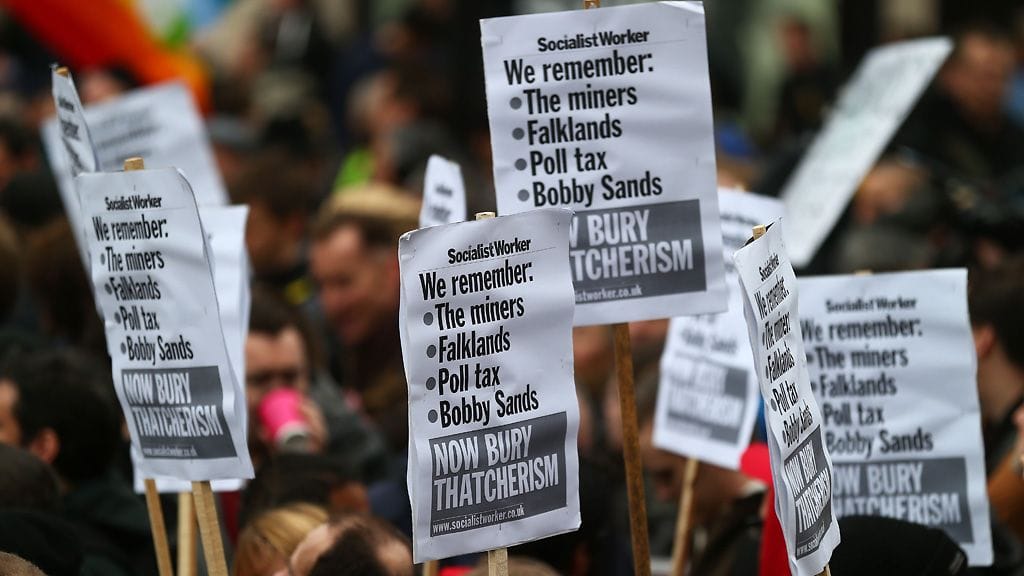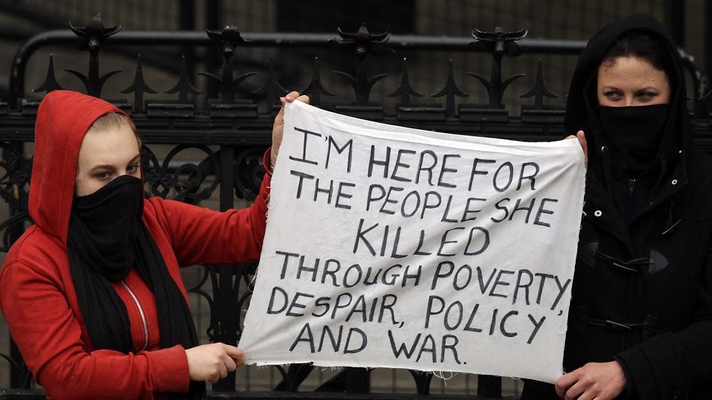 Kiistelty pääministeri herätti protesteja myös hautajaispäivänään. Poliisi kertoi aamulla pidättäneensä kolme miestä epäiltynä Thatcherin vastaisten graffitien teosta ja muusta ilkivallasta.