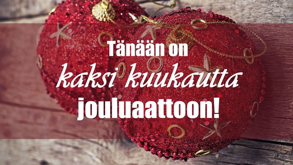 Jouluaattoon on enää kaksi kuukautta, toisin sanoen 8,71 viikkoa tai 0,17 vuotta – miten sen nyt ikinä haluaa ajatellakaan! Vaikka kaksi kuukautta tuntuu pitkältä ajalta, se menee yllättävänkin nopeasti. Jos et valmistaudu lainkaan, huomaat olevasi jouluviikolla ahdistunut ja stressaantunut.