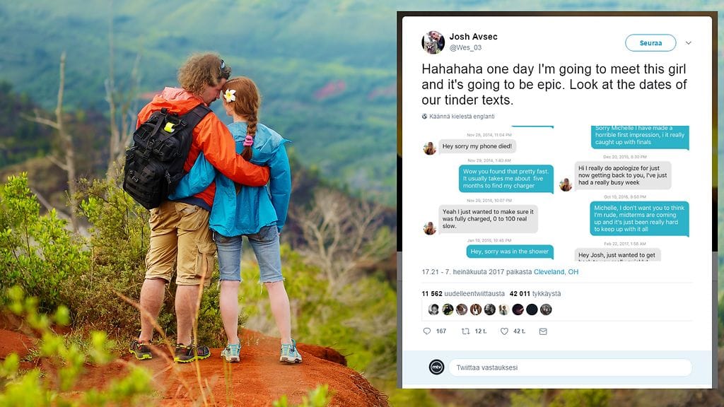Michelle Arendas, 21, ja Josh Avsec, 22, muodostivat Tinder-matchin vuonna 2014. Kaksikon "suhde" ei kuitenkaan ollut salamarakkautta: Avsec julkaisi Twitterissä kuvan parin keskustelusta, joka on jatkunut muutaman viestin vuosivauhtia jo kolmen vuoden ajan.