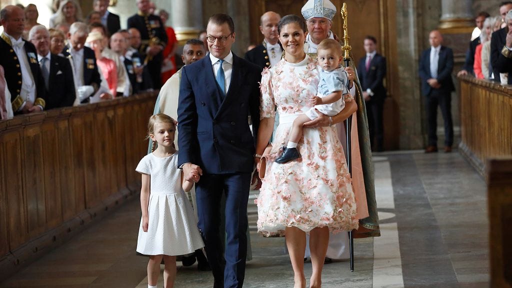 Victorian hänen puolisonsa prinssi Danielin esikoinen, viisivuotias prinsessa Estelle, oli puettu sävy sävyyn äitinsä kanssa. Kuopus, yksivuotias prinssi Oscar, oli kesäisesti liikkeellä shortseissa ja vaaleansinisessä kauluspaidassa.