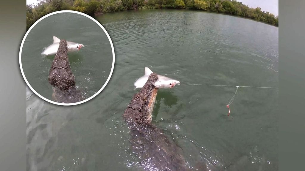 Kalastajan yrittäessä saada haita veivattua veneeseen, muuttui tilanne täysin, sillä vedessä ollut krokotiili päätti saada kalastajan saaliin itselleen.