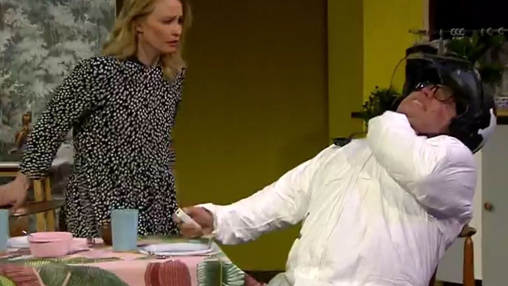 – Mieti nyt Kalle, meidän lapsi änkee toisten ihmisten asuntoihin ja suihkutiloihin välittämättä lainkaan, että Erja oli siellä jo pesulla. Että kyllä tämä on nyt tässä, "Kalle Lambergin" vaimoa näyttelevä Malla Malmivaara sanoo.