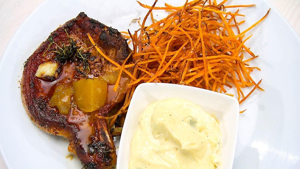 Pipsa Hurmerinnan ja Kalle Lambergin päätehtävän reseptit: Porsaankyljyksiä, kengännauharanskalaisia ja homejuusto-majoneesia sekä paistettua nuudelia ja katkarapua.