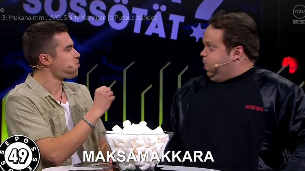 Kalle Lindroth ja Kalle Lamberg tunkivat suunsa täyteen vaahtokarkkeja. Lindroth selitti ensin. Ensimmäinen sana oli maksamakkara, jota Lindroth yritti selittää huitomalla käsillään.