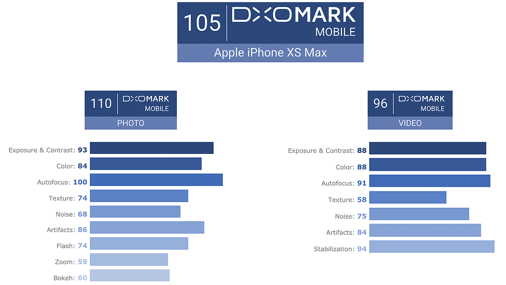 iPhone XS Max keräsi DxOMarkilta 105 pistettä. Pistemäärä oli 110 kuvien ja 96 videoiden osalta. Koska iPhone XS Max ja iPhone XS on varustettu identtisin kameroin, pätee arvosana myös Applen iPhone XS -puhelimista pienikokoisempaan.