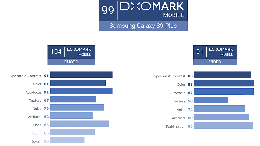 Samsung Galaxy S9+ sai DxOMarkilta yhteisarvosanakseen 99 pistettä, jolla se ohittaa aiemmin kärkipaikkaa 98 pisteellä pitäneen Googlen Pixel 2:n. 97 pistettä ovat saaneet Apple iPhone X ja Huawei Mate 10 Pro.