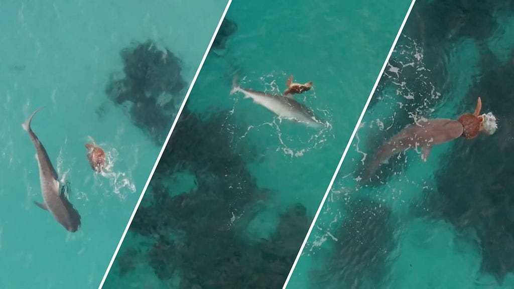 Valokuvaaja todisti Länsi-Australian rannikolla hurjaa tilannetta, jossa kilpikonna joutui taistelemaan hengestään tiikerihain hampaissa.