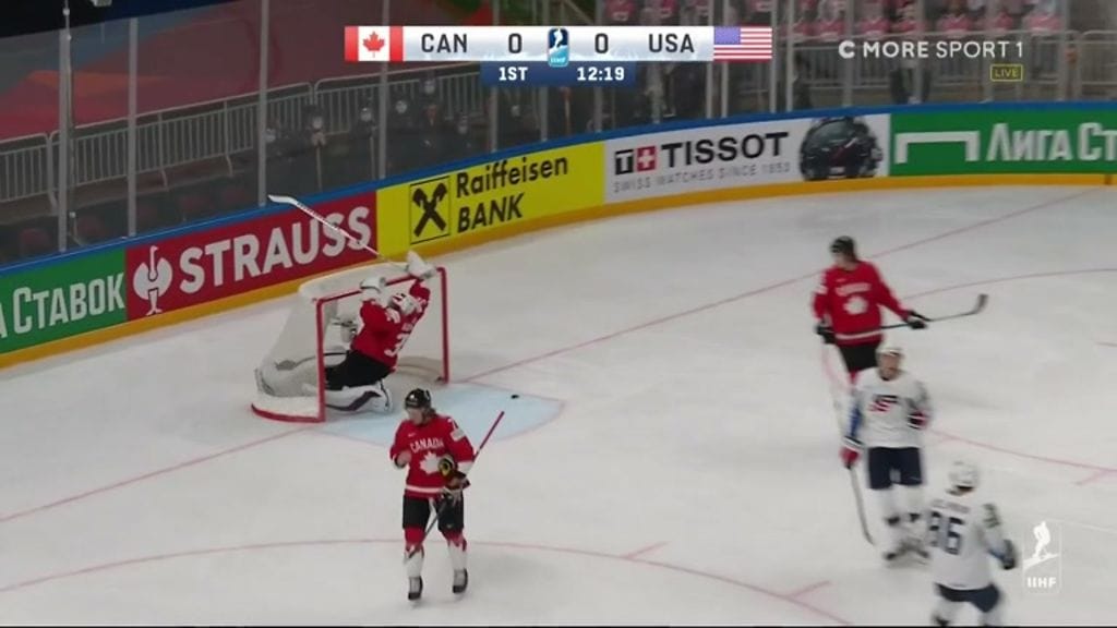 Kanadan NHL-vahti Darcy Kuemper mokasi isosti jääkiekon MM-kisojen USA-ottelun avauserässä.