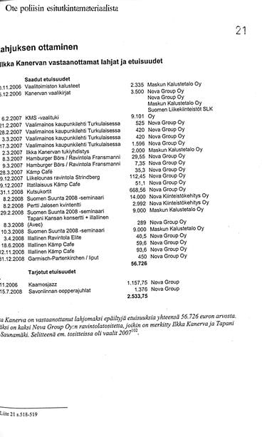 Poliisin esitutkintamateriaalin mukaan kansanedustaja ja entinen ulkoministeri Ilkka Kanerva (kok.) vastaanotti 56 700 euron arvosta erilaisia etuuksia liikemiehiltä.