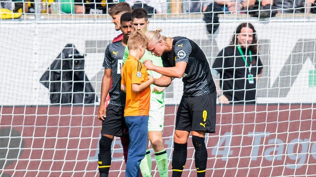 Pelaajat olivat valmistautumassa kulmapotkuun, kun nuori poika asteli kentälle. Muun muassa Sport Bible kertoo pojan juosseen suoraan Dortmundin supertähden Erling Braut Haalandin luokse ja pyytäneen nimikirjoitusta.