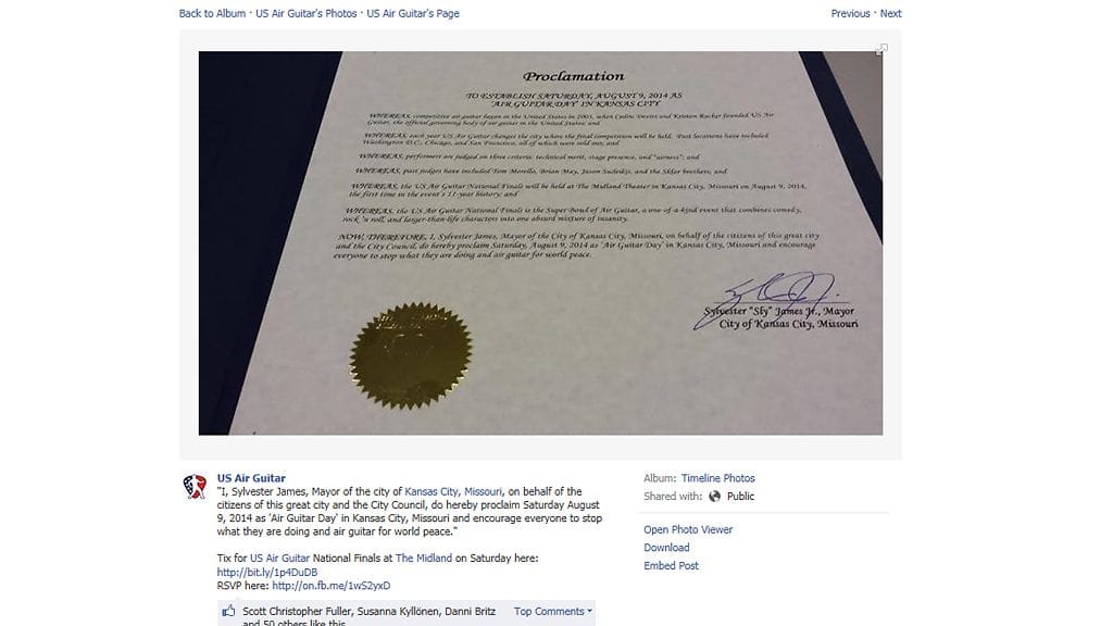 Virallisessa julistuksessaan Kansas Cityn pormestari kehottaa kaikkia kaupungin asukkaita ottamaan osaa ilmakitarapäivään: ”Minä, Sylvester James, Missourin osavaltion Kansas Cityn pormestari, julistan tämän kaupungin asukkaiden ja valtuuston puolesta lauantain 9. elokuuta 2014 viralliseksi ilmakitarapäiväksi Kansas Cityssä, ja kannustan kaikkia keskeyttämään sinä päivänä arkiset askareensa ja soittamaan ilmakitaraa maailmanrauhan puolesta”.