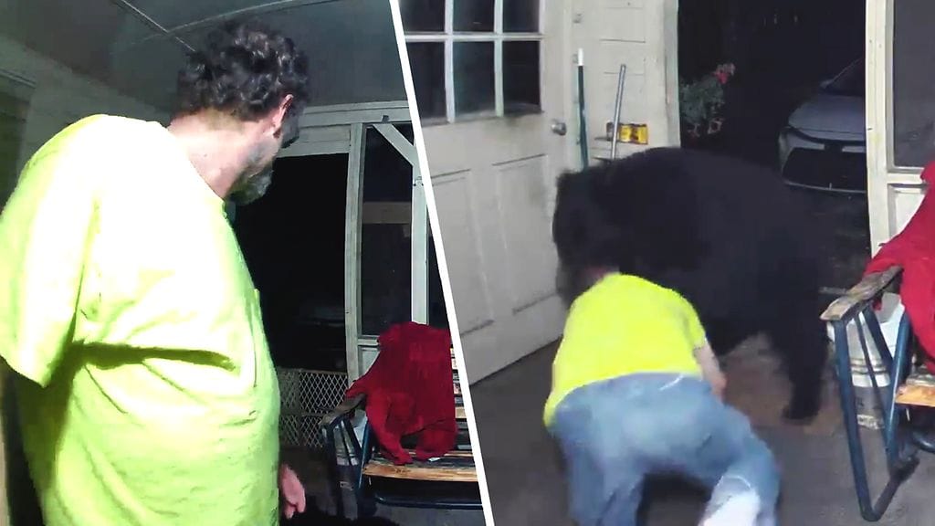 Ovikameralle tallentui pelottava hetki, kun mies taisteli talonsa terassilla karhun kanssa.