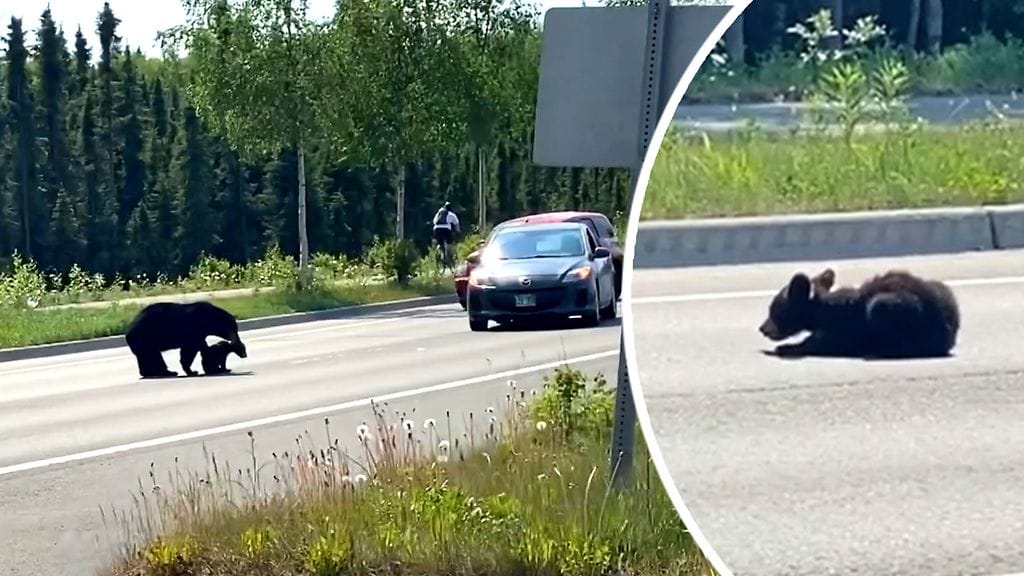 Karhukaksikko laittoi usean minuutin ajaksi liikenteen poikki, kun poikanen päätti jäädä makoilemaan keskelle autotietä.