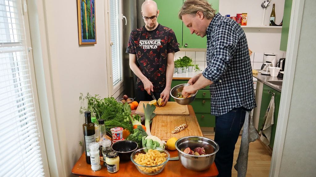 Kape tiedustelee Timolta, eikö pelkän pakastepitsan varassa eläminen ole tylsää.