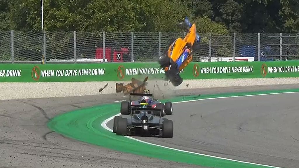 Peroni sinkoutui Campos Racingin autollaan hurjiin voltteihin lauantain F3-kisassa. Syynä tähän oli Parabolica-mutkan ulosajoalueella ollut "makkaramainen" kanttikivi, josta auto suuntautui voimalla ylös päin.