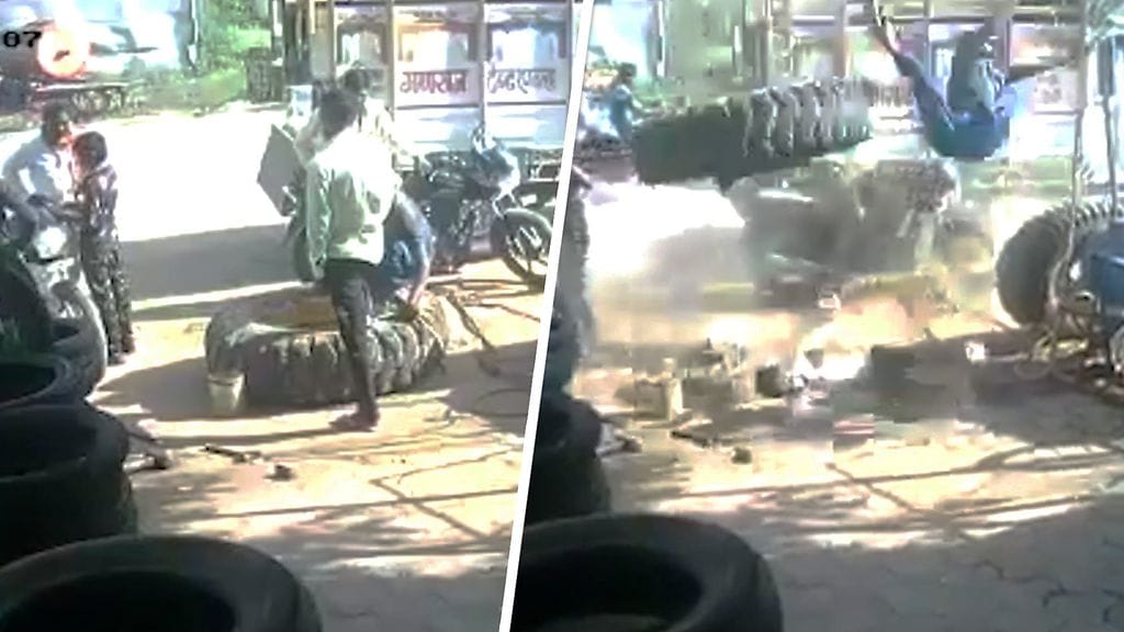 Videolla näkyy, kuinka kaksi miestä täyttivät rengasta, joka yhtäkkiä räjähti. Miehet lensivät purkautuneen ilmanpaineen seurauksena välittömästi ilmaan.