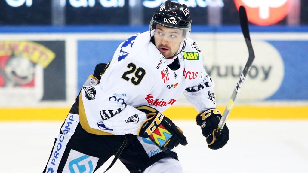 Osuma oli Nättiselle kauden kolmas. Nättinen kantaa ottelussa JYPin kultaista kypärää.