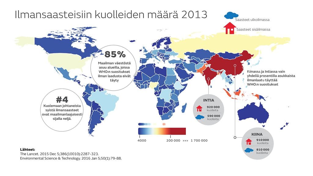 Kiinassa huonon ilmanlaadun aiheuttamiin sairauksiin kuoli 2013 yli 1,7 miljoonaa ihmistä. Intiassa vastava luku on 1,5 miljoonaa. Asia ylipäänsä on maailman saastuneinta aluetta: yli 60 prosenttia saastekuolemista sijoittui tälle mantereelle.