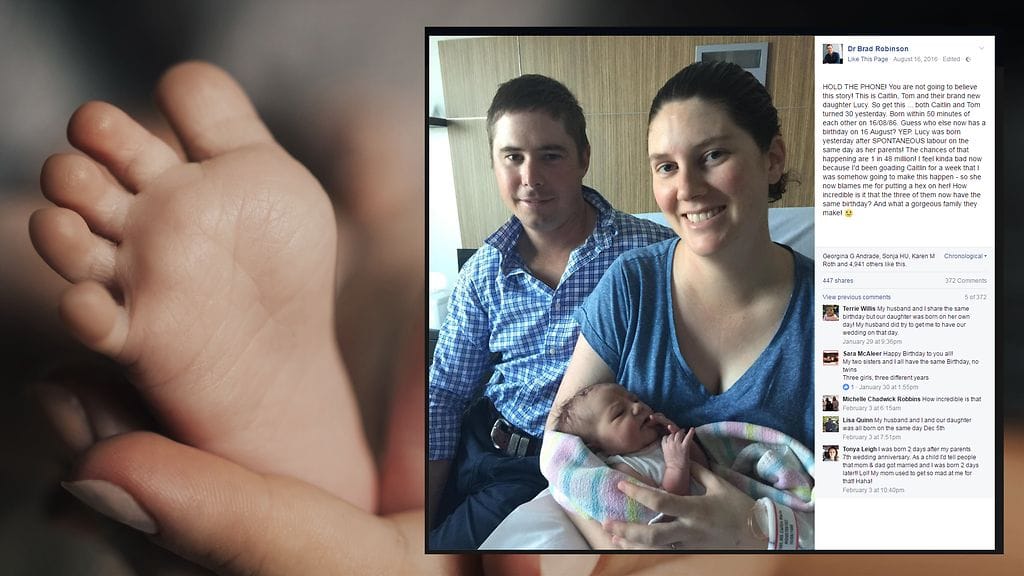 Australialaispariskunta sai vauvan, jolla on sama syntymäpäivä kuin vanhemmillaan. Caitlin ja Tom Perkins ovat kumpikin syntyneet 16.8.1986, vain 50 minuutin sisällä toisistaan.