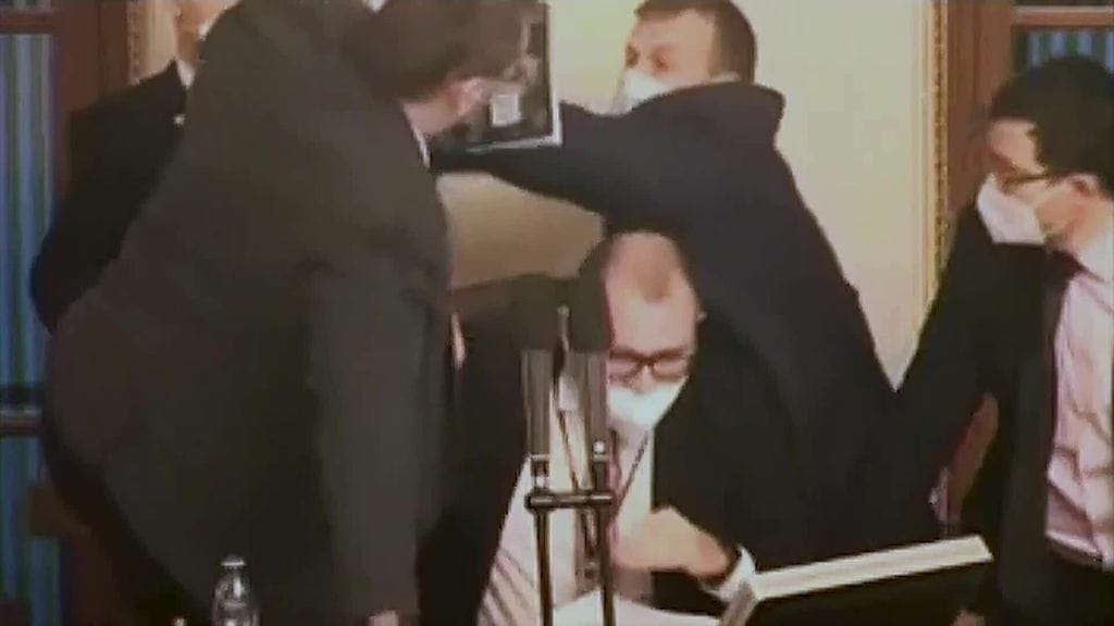 Parlamentissa Tšekin pääkaupungissa Prahassa puhkesi torstaina suoranainen tappelu, kun lainsäätäjä kieltäytyi käyttämästä kasvomaskia puheenjohtajan läheisyydessä.