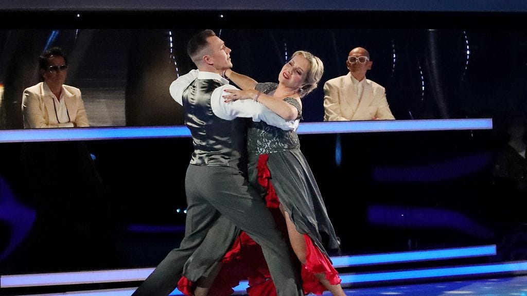 Näyttelijä Katariina Kaitue ja hänen opettajansa Anssi Heikkilä tanssivat ensimmäisessä livessään tunteikkaan wieninvalssin kappaleenaan Edith Piafin Sous le ciel de Paris.