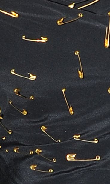 Kaunotar oli valinnut ylleen tyylikkään pikkumustan, johon hauskan lisän toivat kankaaseen kiinnitetyt pienet, kultaiset hakaneulat. Tässä hauska vinkki suomalaisnaisille oman asun tuunaamiseen!