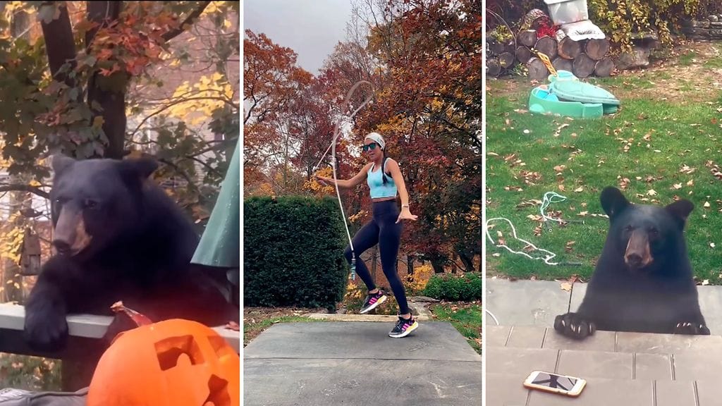 Nainen kuvasi treenivideota takapihallaan, kun yllättäen hänen selustaansa hiipi utelias mustakarhu.
