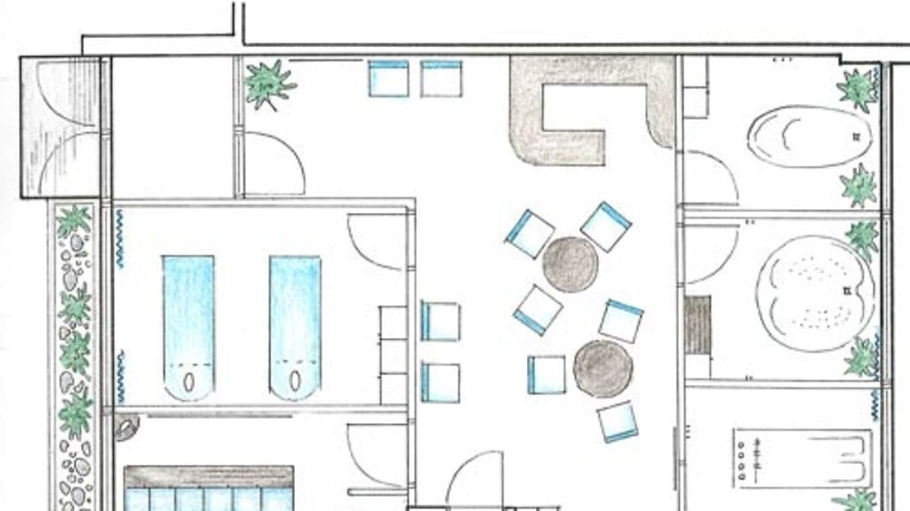 Pesutilojen yhteydessä olevasta pukuhuoneesta poistetaan kiinteä istuin ja tilalle tuodaan kaksi tummaa rottinkista lepotuolia valkoisilla pehmustetyynyillä sekä turkoosin ja ruskean sävyinen villamatto. Takaseinä maalataan maalarinvalkoisella. Pesuhuoneen lasitiiliseinän rikkoontunut lasitiili uusitaan ja sinne asennetaan hohtavanvalkoinen kylpyamme nostamaan asunnon arvoa.