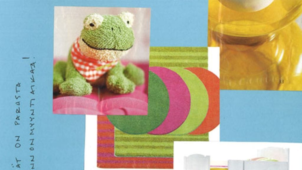 Ahtaasta lastenhuoneesta poistetaan rohkeasti tavaraa. Jäävät tavarat sijoitellaan uudelleen ja kauniin, punaisen laskosverhon viereen laitetaan pitkä, iloisenvärinen verho. Matto ja vuodepeitteet valitaan verhojen sävyyn.