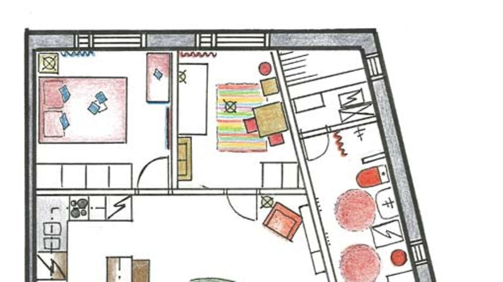 Asunnon pohja on mielenkiintoinen epäsymmetrisyydessään. Sisustus on värikäs harmonisella tavalla. Seinät ovat valkoiset ja lattiaan on vasta asennettu upea koivuparketti. Suurimpana hidasteena myynnin kannalta näkisin viisihenkisen perheen suuren tavaramäärän. Lasten vaatteita, leluja ja kirjoja on PALJON. Tosin nekin ovat järjestyksessä, mutta…