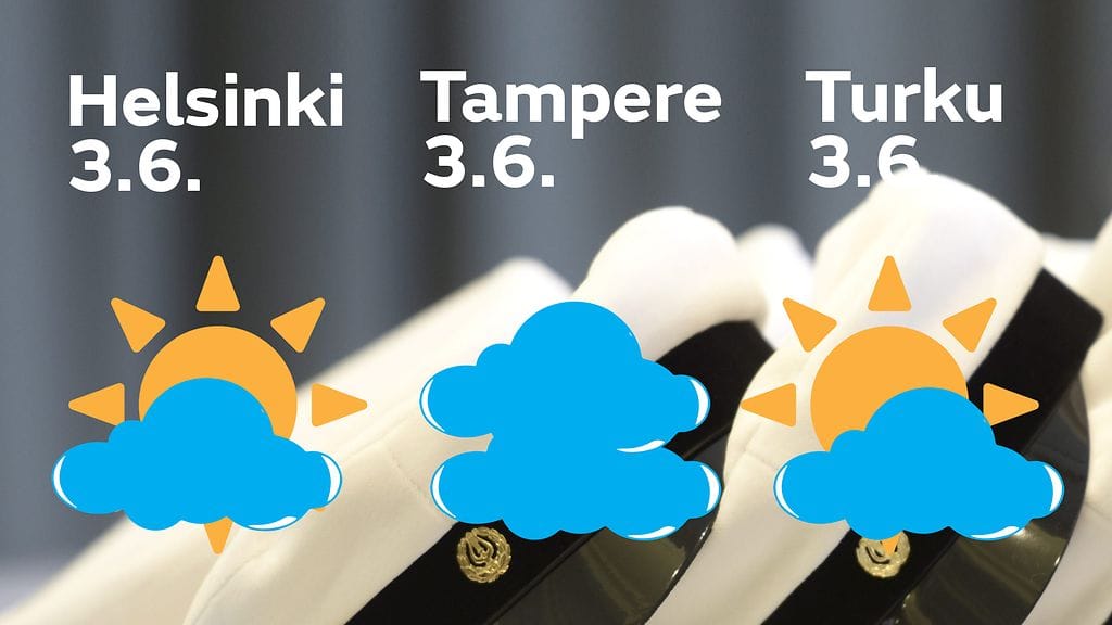 Katso yläpuolella olevasta taulukosta oman paikkakuntasi sää lakkiaisviikonlopulle. Taulukossa on kaikkiaan 102 paikkakunnan sää torstaista maanantaihin.