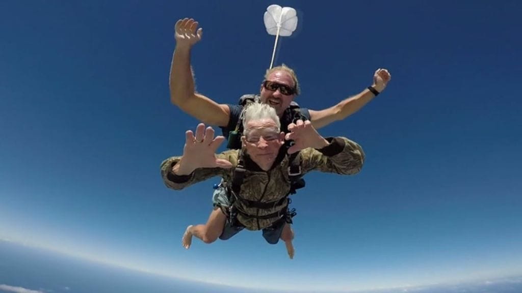 Mikä teräspappa! Katso 100-vuotiaan synttärihyppy yläpuolelta!