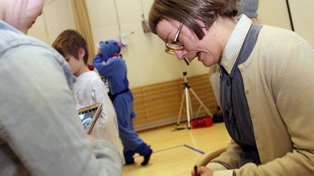 Putouksen sketsihahmokisan voittanut Aina Inkeri Ankeinen vieraili espoolaisessa koulussa koulun Putous-päivänä.