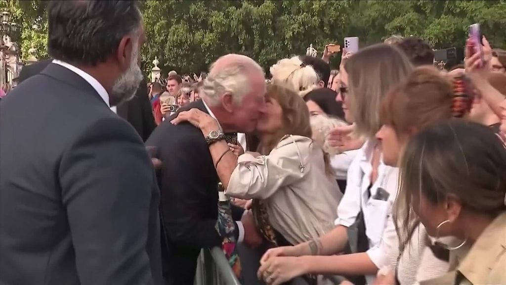 Charles kätteli ja kiitti kansaa Lontoossa Buckinghamin palatsin edustalla. Joukossa oli Kyprokselta kotoisin oleva Jenny Assiminios, joka pääsi tekemään kuninkaan kanssa varsin läheistä tuttavuutta.