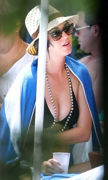 Uima-altaalla viihtyneen Perryn tiimalasivartalo näytti upealta – bikinit sopivatkin loistavasti tällaiselle vartalotyypille, vaikka oikean kokoisten bikineitten löytäminen onkin vaikeaa! Kaarituelliset bikinit tukevat isorintaisempaa naista parhaiten ja niskasta sidottava bikiniyläosa kohottaa rintoja mukavasti.
