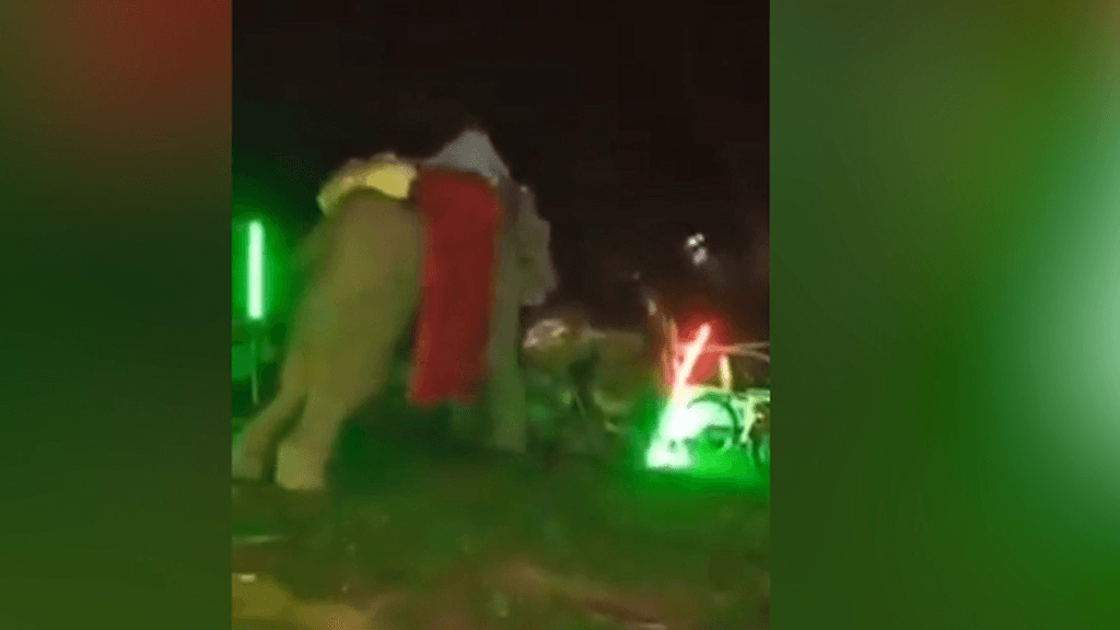 Yllä olevalla videolla nähdään, kuinka eläin kaataa auton katolleen kärsällään. Ihmiset huutavat ja juoksevat alueelta pois.