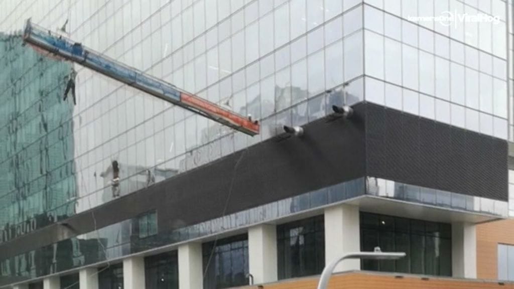 Työn raadollisen puolen todistaa kanadalaiskaupunki Edmontonin Stantec Towerissa tapahtunut tilanne, jossa pesuteline lähti totaalisesti työntekijöiden hallinnasta.