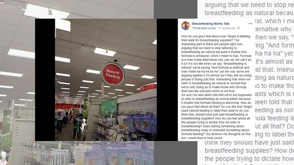 Breastfeeding Mama Talk -sivusto kysyi Facebookissa lukijoidensa mielipidettä Target-kauppaketjun kylttiin. Kaupassa imetysapuvälineet oli merkitty kyltillä "Natural Feeding", suom. luonnollinen ruokkiminen.