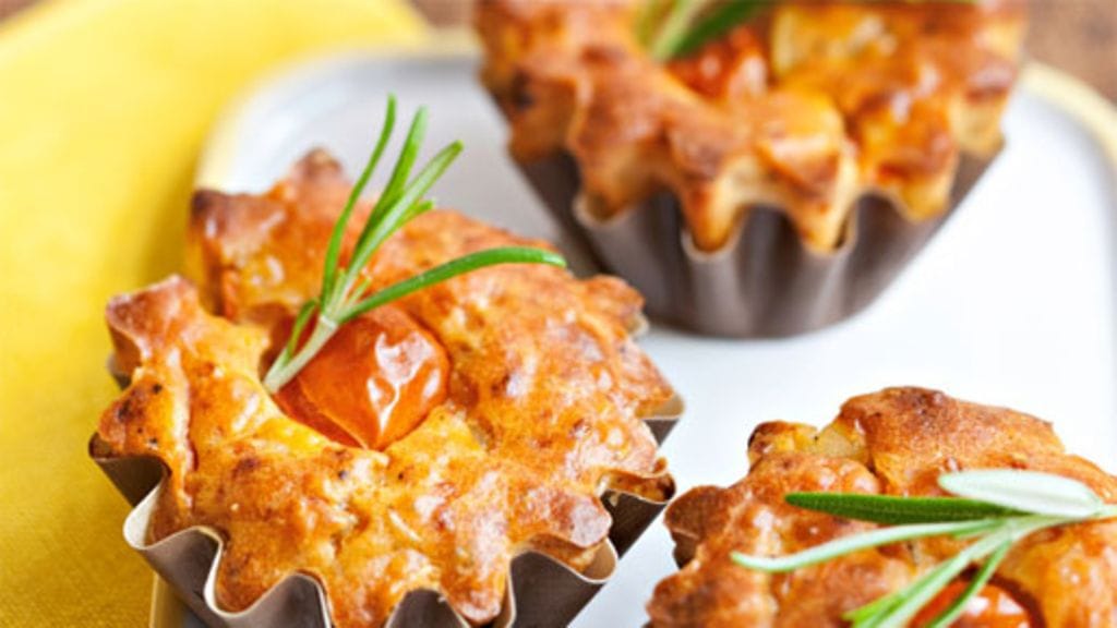 Sekoita kuivat aineet keskenään. Pilko romaatit, jätä 6 kpl talteen. Lisää muut aineet sekaan. Lusikoi taikina isoihin silikonisiin muffinivuokiin tai -pellille (voitele tarvittaessa), laita jokaisen päälle puolikas kirsikkatomaatti ja paista 200-asteisen uunin toisiksi alimmalla tasolla 15–25 min muffinien koosta riippuen.