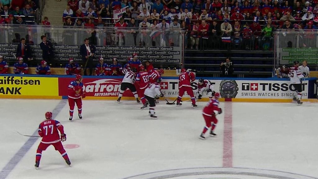 Kiekko pyöri Venäjän vaihtoaition edessä, ja samaan aikaan aitiosta hyppäsi jäälle enemmän pelaajia kuin säännöt sallivat. Tuomaristolta meni täysin ohi, että Venäjällä oli muutaman sekunnin ajan kaksi ylimääräistä pelaajaa jäällä.
