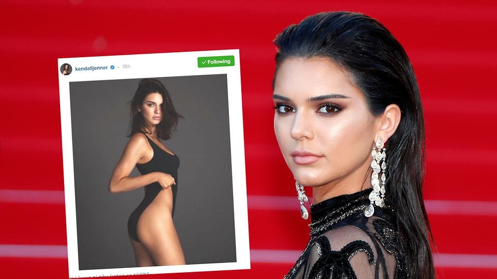 Kuvassa Kendall poseeraa viettelevästi mustassa uimapuvussa, jonka jalansuun hän on vetänyt ylös lanteilleen paljastaen samalla mojovan palan pakaraansa.