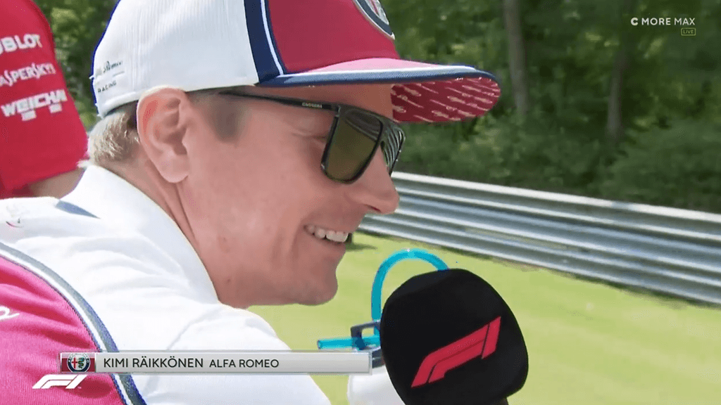 Alfa Romeo -kuljettajaa haastateltiin kuskiparaatissa ennen Unkarin kilpailua. Suomalaistähti nojasi kulkuneuvon reunaan vastatessaan kysymyksiin, mikä ilmeisesti huvitti toimittajaa.