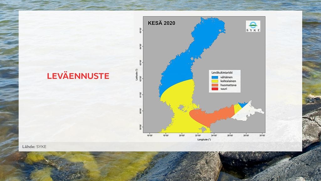 Tänä kesänä sinileväriski on Suomenlahdella itäosaa lukuunottamatta huomattava. Pääosassa Saaristomerta, Itämeren pääaltaan pohjoisosassa ja Selkämeren eteläosassa riski on kohtalainen. Näin ennakoi Suomen ympäristökeskus tänään julkistetussa leväennusteessaan.
